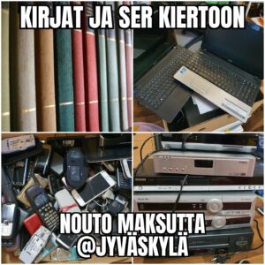 Kierrätä ja Auta ry taistelee luonnonvarojen puolesta tarjoamalla kierrätyspalvelua yksityisille henkilöille ja yrityksille. Tarjoamme maksuttoman ja vaivattoman noutopalvelun kaikelle pienikokoiselle kodin ja toimiston irtaimelle. Täytä lomake sivuillamme, niin sovitaan nouto: https://kierratajaauta.fi/.